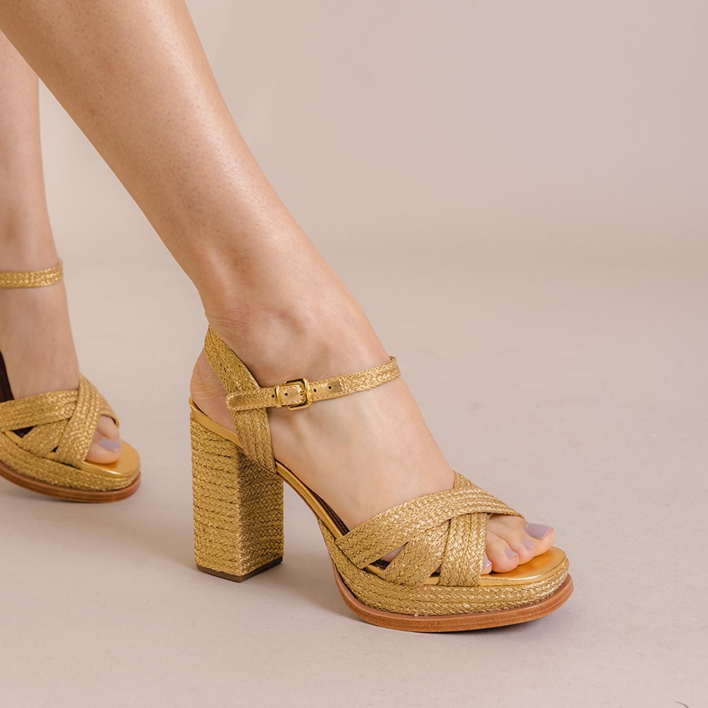 Estas hermosas piezas doradas elevan cualquier conjunto con su diseño trenzado y tacón robusto, proporcionando un equilibrio perfecto entre estilo y comodidad.