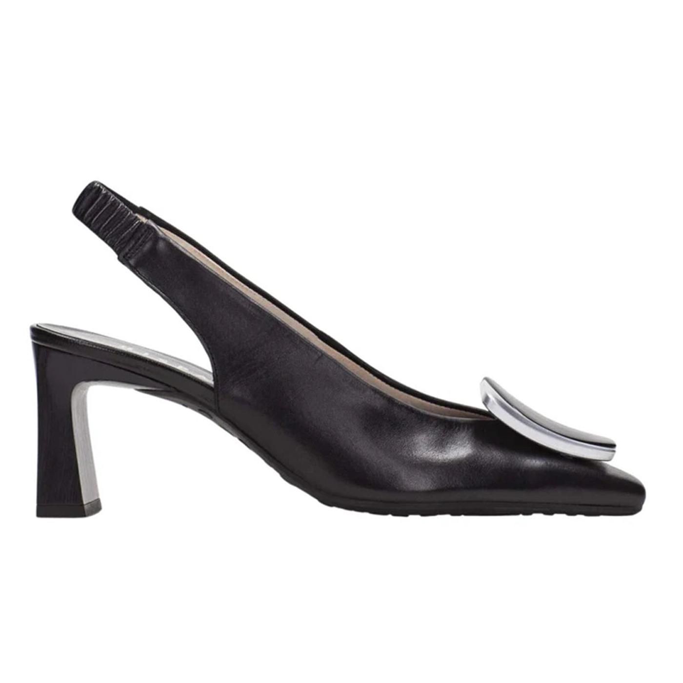 - Zapato tipo slingback (destalonado) con puntera cerrada y líneas suaves.