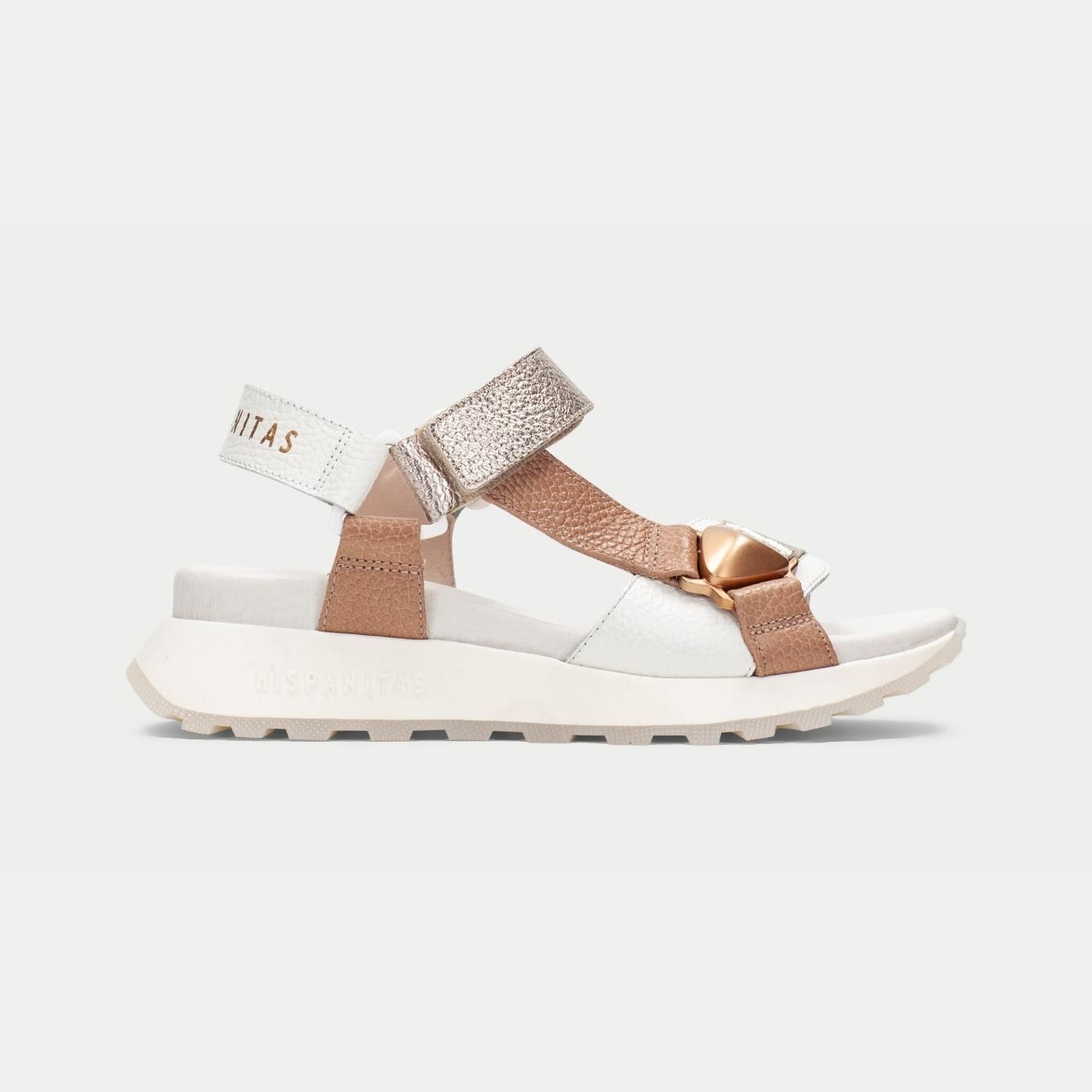 La sandalia HISPANITAS CHV264807 destaca por su diseño contemporáneo y sofisticado, combinando estilo urbano y máxima comodidad. Su estética en tonos neutros, con detalles en blanco y beige, se complementa con un elegante aplique metálico en la parte frontal que aporta un toque moderno y femenino.
