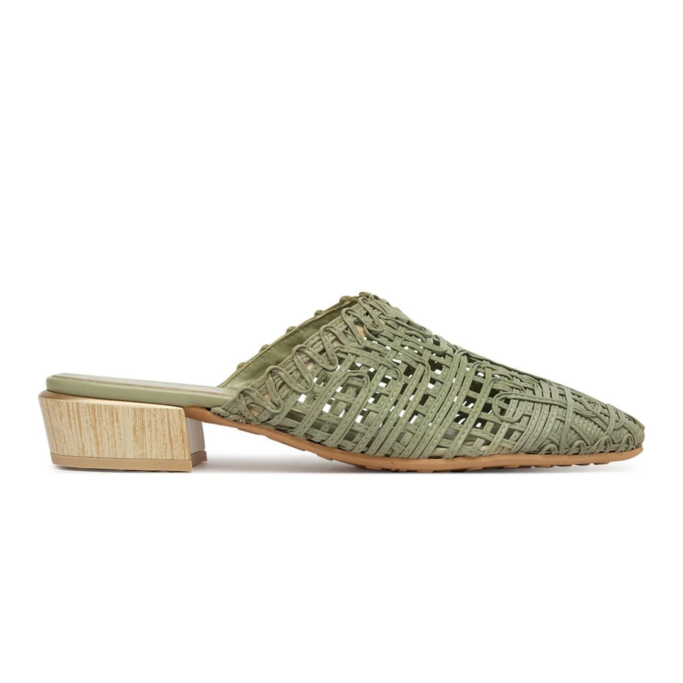 Su diseño destaca por el acabado trenzado tipo rejilla en la parte superior, que no solo aporta textura y personalidad, sino también ligereza visual. El tono verde suave añade un aire contemporáneo y fácil de combinar, perfecto para la temporada primavera-verano.
