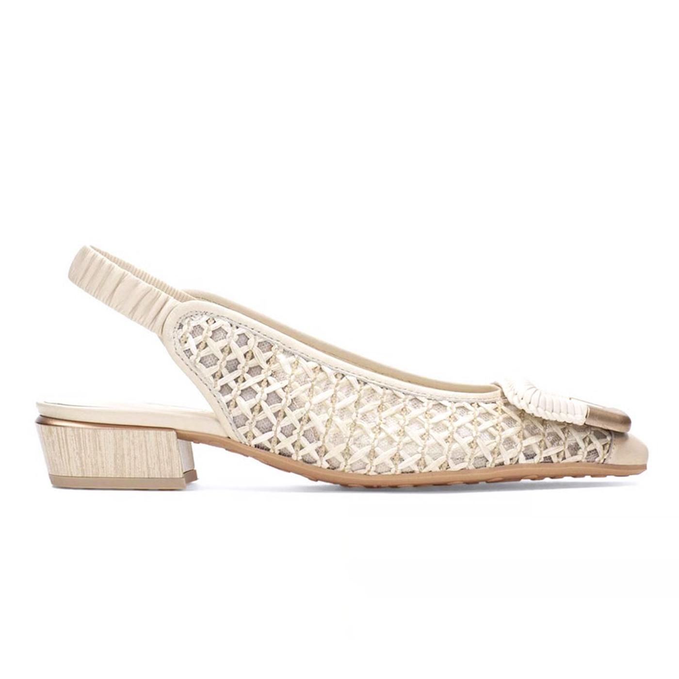 Este zapato presenta una silueta estilizada con puntera ligeramente cuadrada y un delicado adorno frontal que aporta un toque distintivo y elegante. Su diseño destalonado incorpora una tira elástica trasera que se adapta suavemente al talón, proporcionando un ajuste seguro y cómodo. El acabado en tono neutro aporta luminosidad y facilita su combinación con múltiples looks.