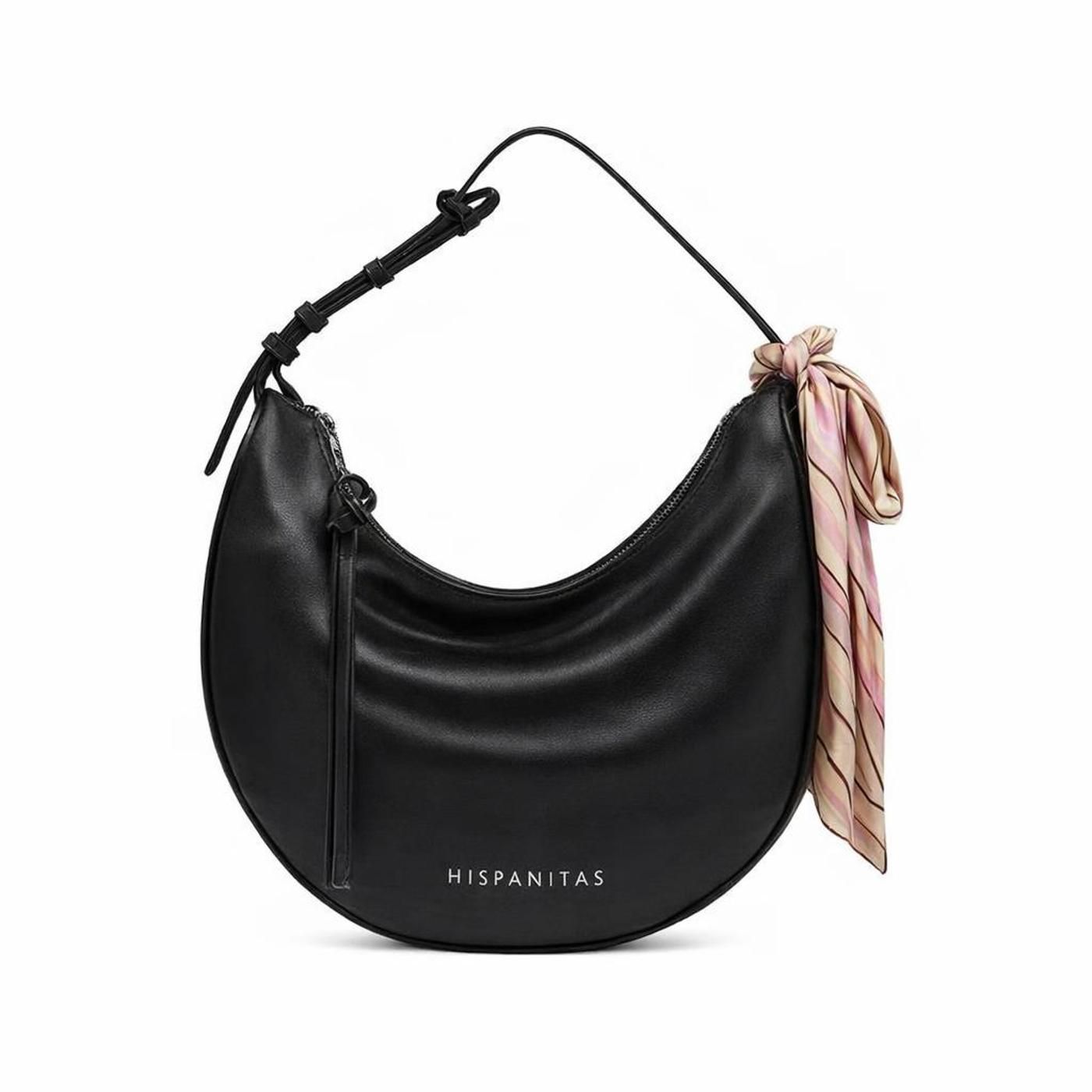 El bolso HISPANITAS BV264537 destaca por su elegante diseño tipo hobo con silueta de media luna, aportando un estilo sofisticado y atemporal. Su acabado en color negro liso realza su versatilidad, mientras que el detalle de pañuelo decorativo anudado en el asa añade un toque femenino y distintivo.