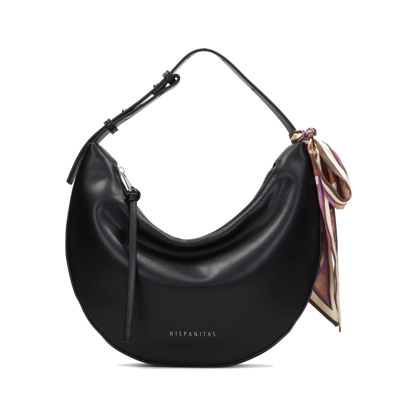 El bolso HISPANITAS BV264537 destaca por su elegante diseño tipo hobo con silueta de media luna, aportando un estilo sofisticado y atemporal. Su acabado en color negro liso realza su versatilidad, mientras que el detalle de pañuelo decorativo anudado en el asa añade un toque femenino y distintivo.