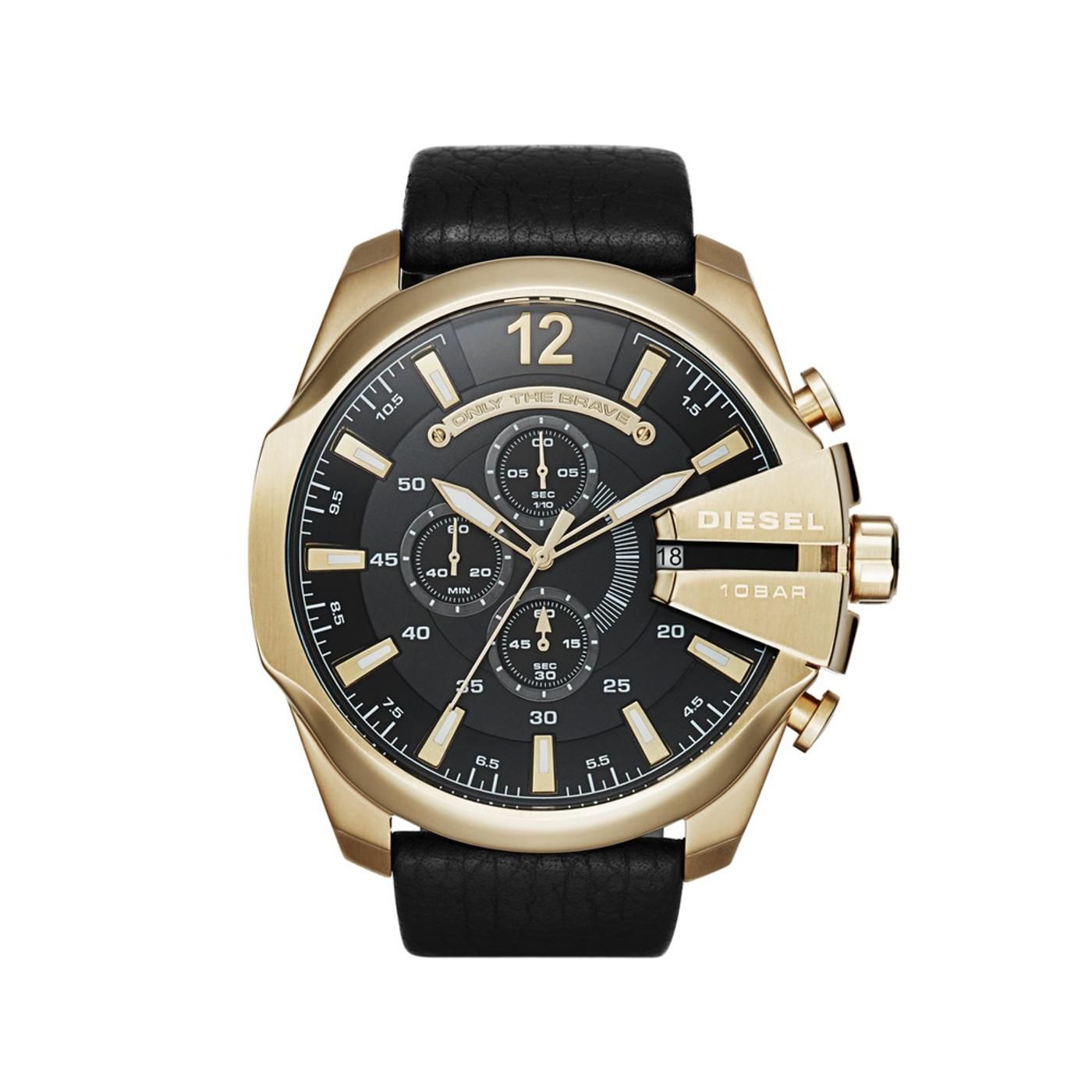 Este reloj marca Diesel tiene una caja de Acero inoxidable con revestimiento dorado con un diámetro de 51 mm y cuenta con una correa de piel.