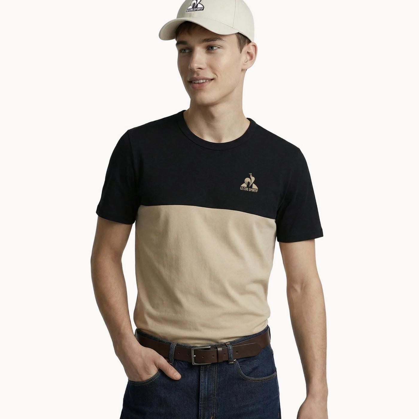 La camiseta LE COQ SPORTIF 2610345 destaca por su diseño moderno y elegante, combinando un corte limpio con un atractivo contraste en negro y beige con estampado tipo safari. Una prenda versátil que reinterpreta el estilo deportivo con un enfoque sofisticado, ideal para el uso diario y para quienes buscan un look casual con personalidad.