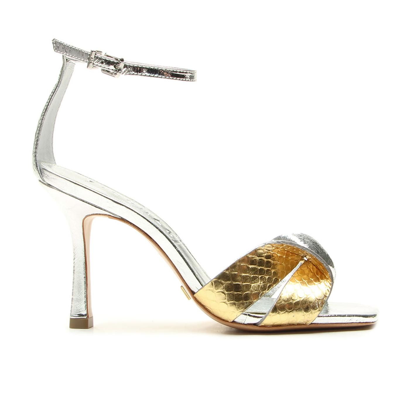 Este modelo combina el brillo del acabado metalizado con la textura croco y el diseño de tiras, creando un calzado impactante que eleva cualquier conjunto con un toque moderno y glamuroso.