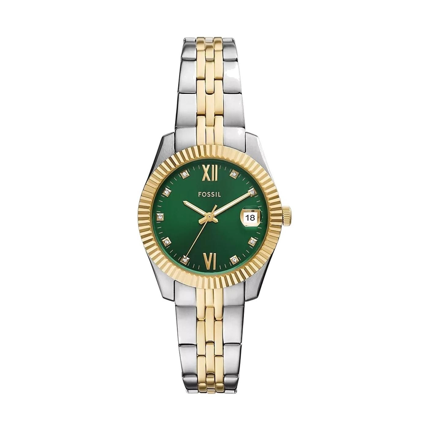 Este Scarlette de 32 mm cuenta con una esfera verde con efecto rayos de sol, movimiento de fecha de tres manecillas y brazalete de acero inoxidable de dos tonos.