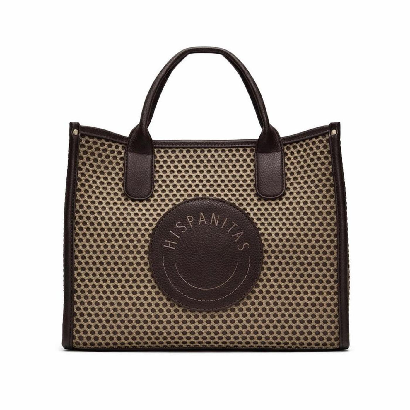 Visualmente, presenta un atractivo contraste entre el cuerpo principal con acabado texturizado tipo rejilla en tono marrón y los detalles en material liso efecto piel en color marrón oscuro. En la parte frontal incorpora un amplio aplique circular con el logotipo grabado de HISPANITAS, que aporta identidad y un toque distintivo al diseño.