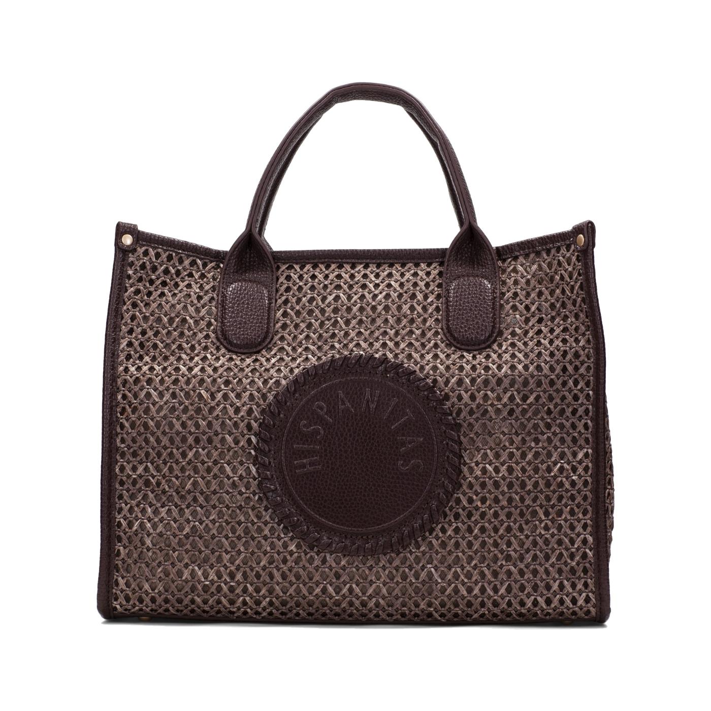 Visualmente, presenta un atractivo contraste entre el cuerpo principal con acabado texturizado tipo rejilla en tono marrón y los detalles en material liso efecto piel en color marrón oscuro. En la parte frontal incorpora un amplio aplique circular con el logotipo grabado de HISPANITAS, que aporta identidad y un toque distintivo al diseño.